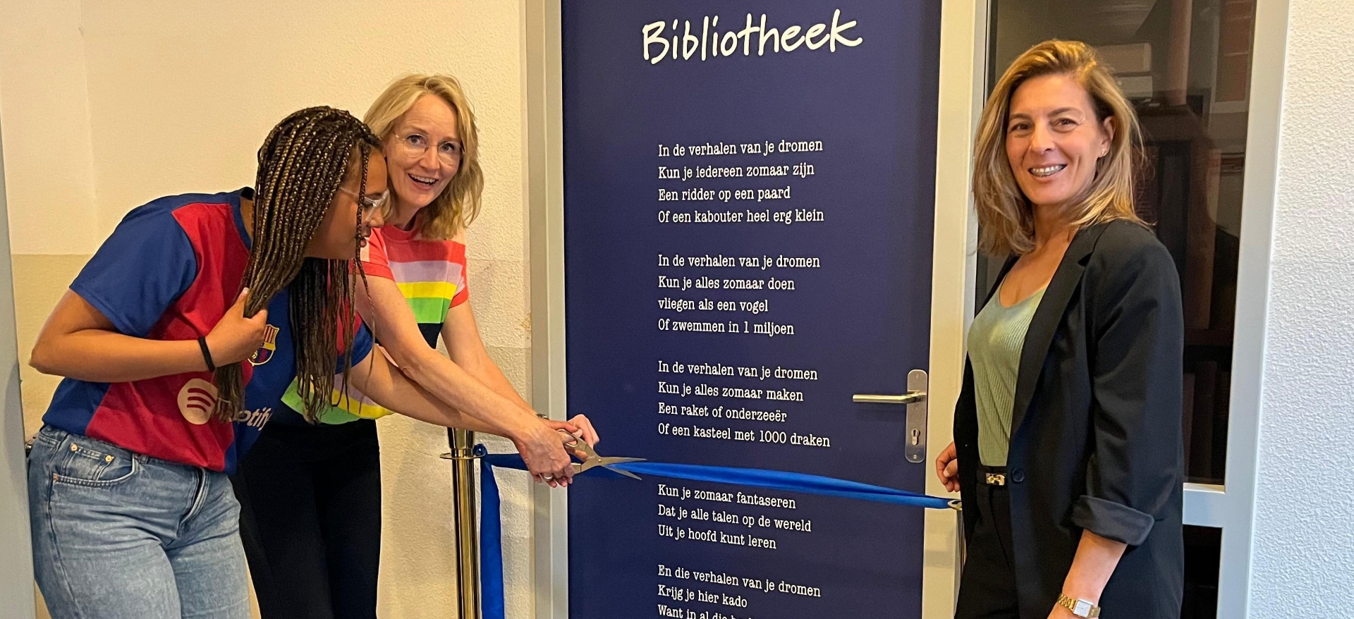 Om 10.30 uur werd de bibliotheek officieel geopend. Samen met leerlingenraadlid Faith en teamleider Salima Omairi knipte Eva het lint door met een gouden schaar.
