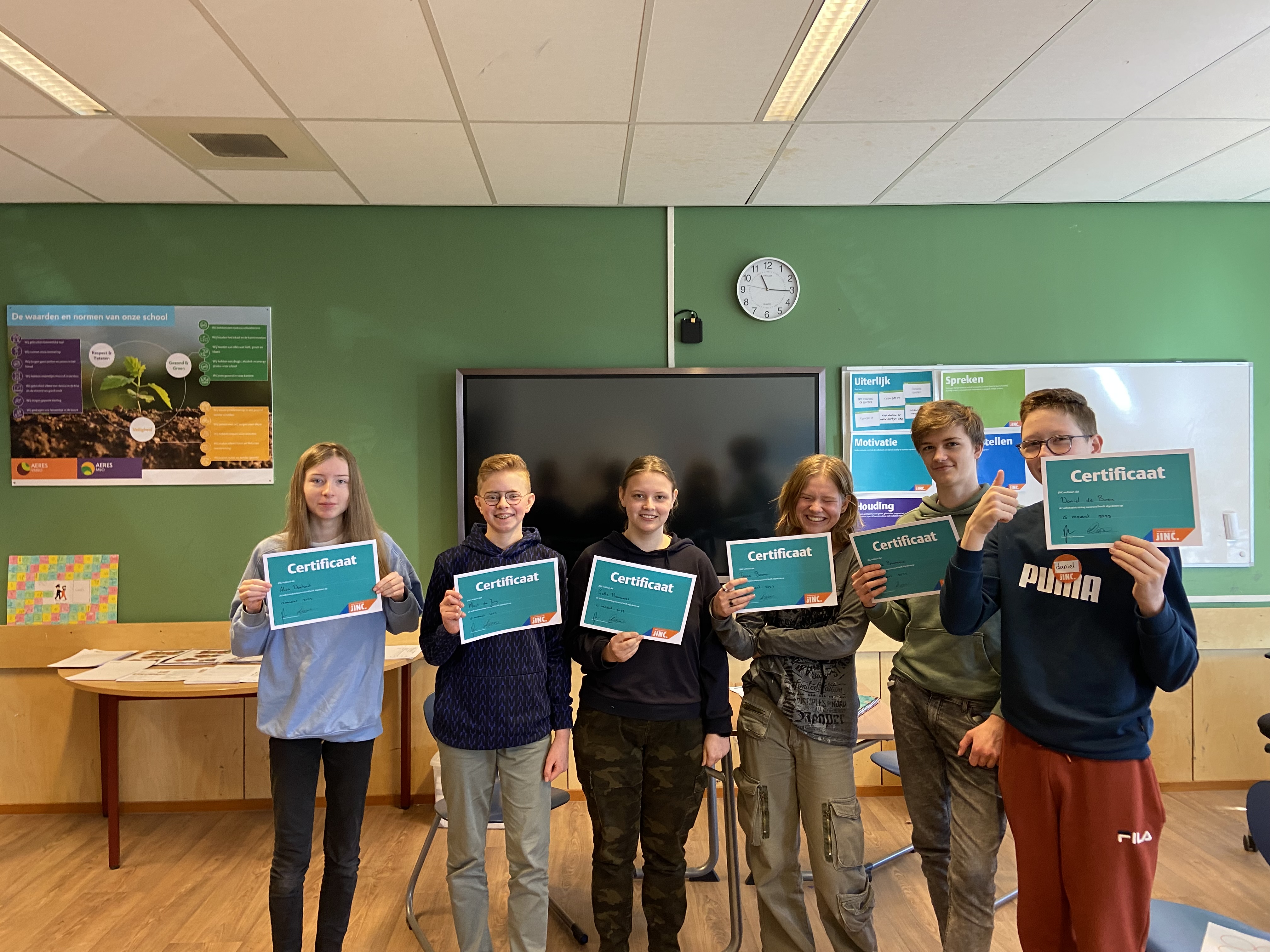 De groep kreeg diverse stellingen voorgeschoteld en er weren veel praktische tips gedeeld. Zoals de dont's van een mailadres zoals 'hotchickie99@gmail.com' of ‘player8@hotmail.com’ en dat je jezelf bewust moet zijn van een passende houding, taalgebruik en uiterlijk. Ook een verzorgd CV is belangrijk, omdat veel werkgevers op basis hiervan een eerste kandidatenselectie maken. Tot slot is het ook prima om persoonlijke zaken te delen, zoals hobby's of cursussen die je hebt gevolgd. Al met al een inspirerende en leerzame dag voor onze toekomstige generatie. De certificaten zijn dik verdiend!