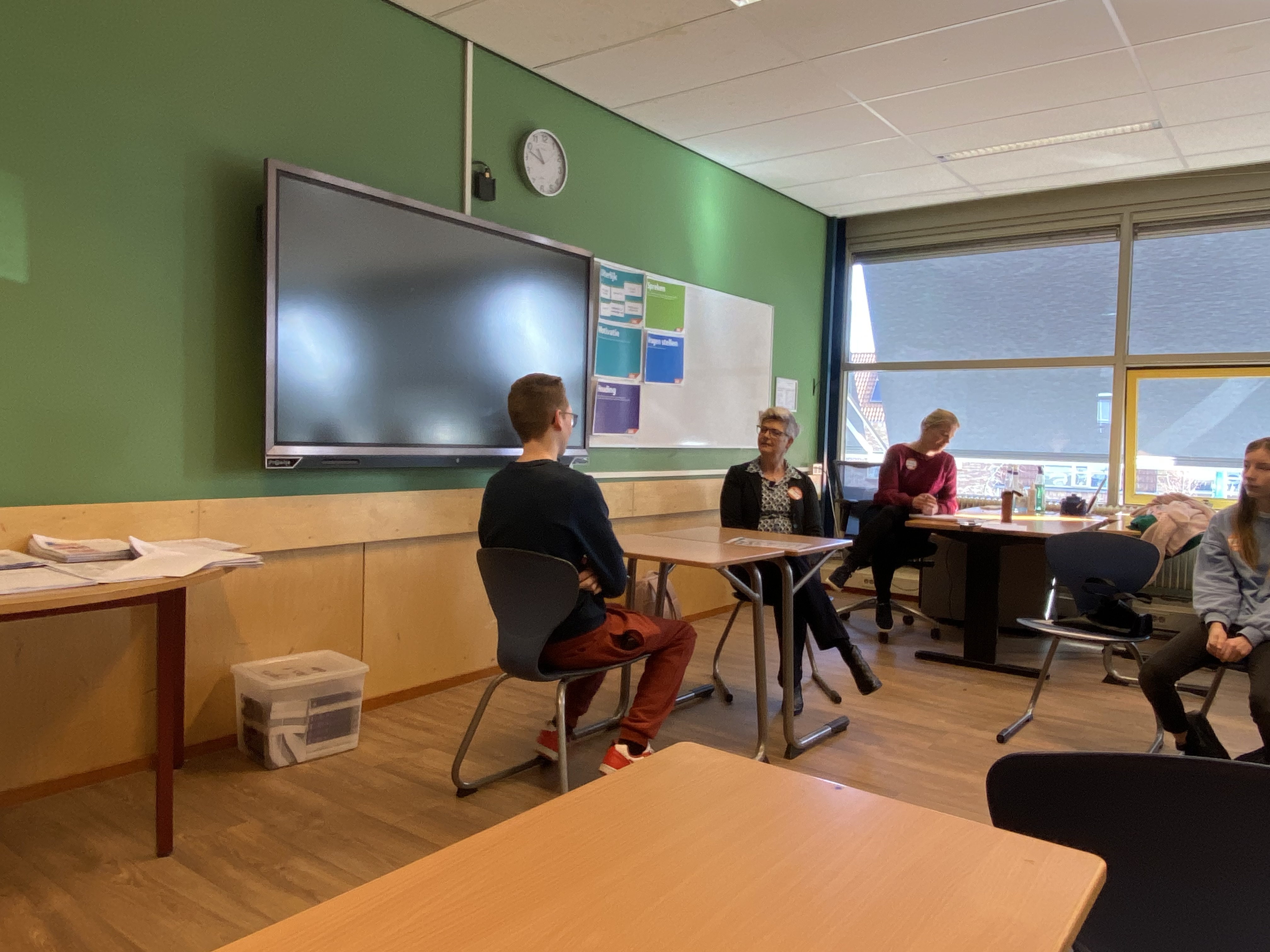 We liepen mee met een groep leerlingen van klas 3.6. Na een korte introductie volgde een vragenrondje met antwoorden op ‘Heb je al eens gesolliciteerd?’, ‘Hoe verliep zo'n gesprek?’, ‘Wat is je droombaan?’ en ‘Heb je al een bijbaantje?’. Daarna werd er een verkeerd voorbeeld van een sollicitatiegesprek opgevoerd. Gelukkig konden de leerlingen goed vertellen wat er zoal misging tijdens dit ‘demonstratiegesprek’. Vervolgens was het de beurt aan henzelf. Van de 7 leerlingen deden er maar liefst twee een spontaan ‘proefsollicitatiegesprek’. Deze gingen erg goed, aangezien ze geen voorbereiding hadden gehad.
