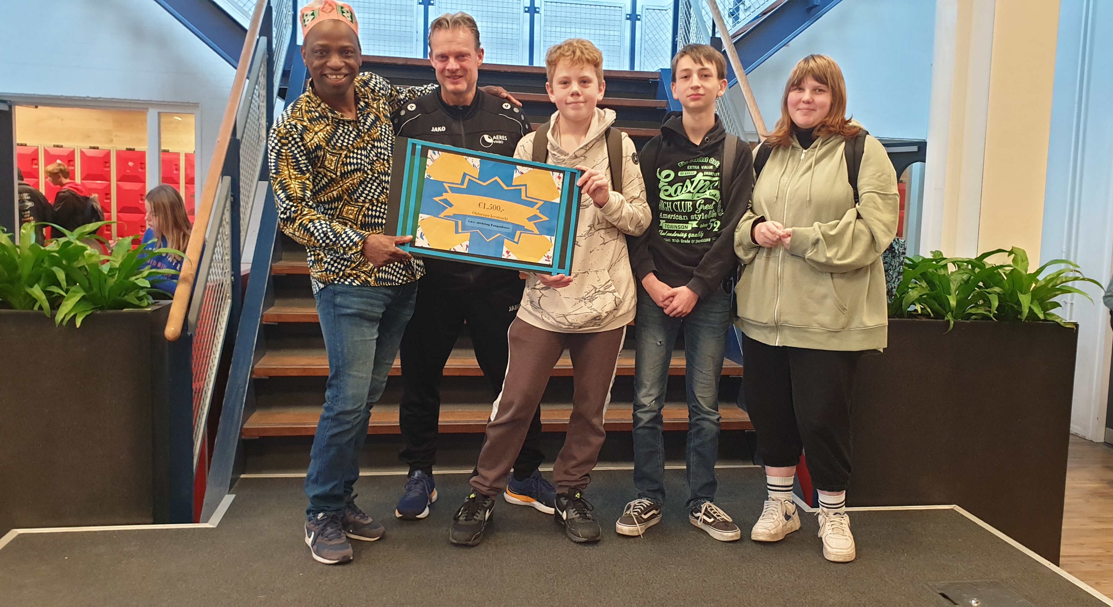 Op de foto zie je van links naar rechts: Mahmoud Ba (stichting), Richard Wolma (docent) en leerlingen: Noud, Joey en Fenna.